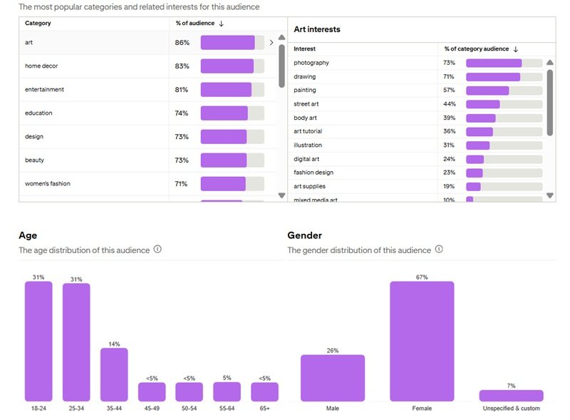 According to Pinterest data, you can see how younger audiences engage with content across different niches. And yes, most Pinterest users are female and have interests in multiple topics.
